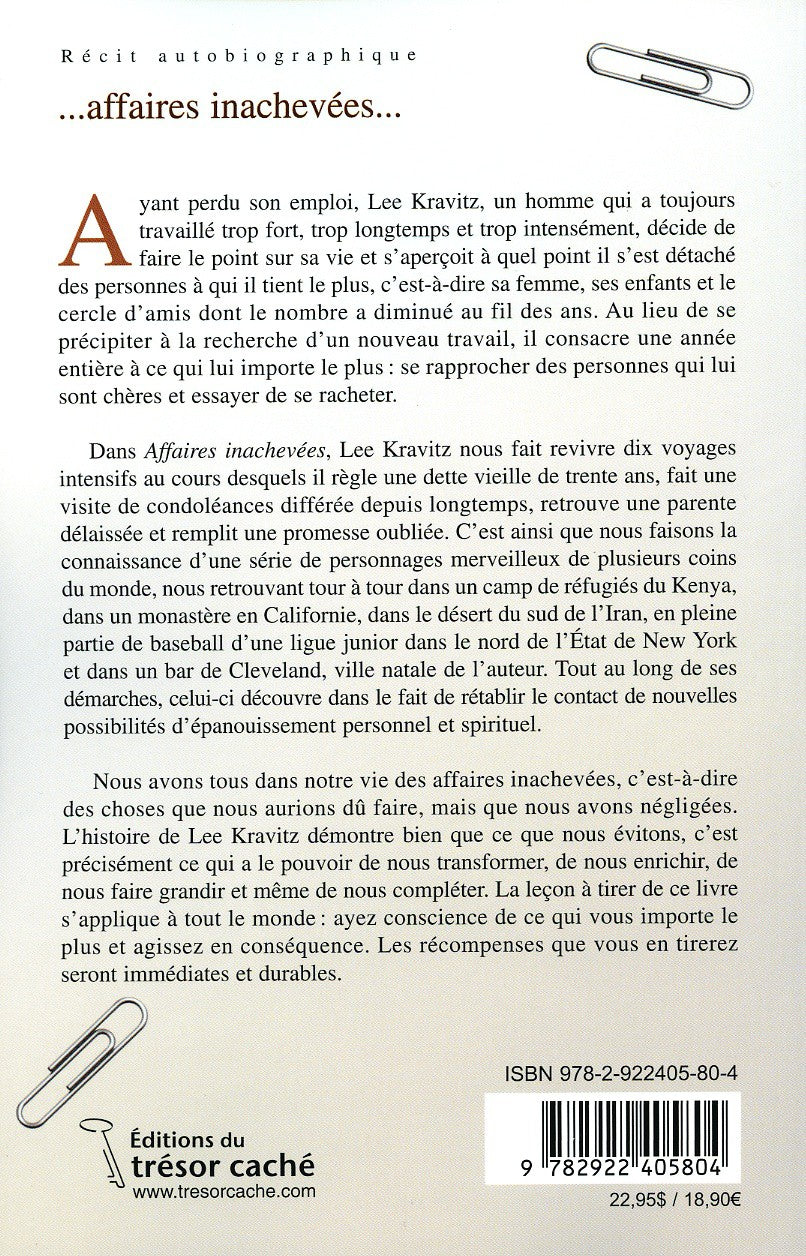 Nous avons tous dans notre vie des affaires inachevées, c'est-à-dire des choses que nous aurions dû faire, mais que nous avons négligées. L'histoire de Lee Kravitz démontre bien que ce que nous évitons, c'est précisément ce qui a le pouvoir de nous transformer, de nous enrichir, de nous faire grandir et même de nous compléter. La leçon à tirer de ce livre s'applique à tout le monde : ayez conscience de ce qui vous importe le plus et agissez en conséquence. Les récompenses que vous en tirerez seront immédiates et durables.
