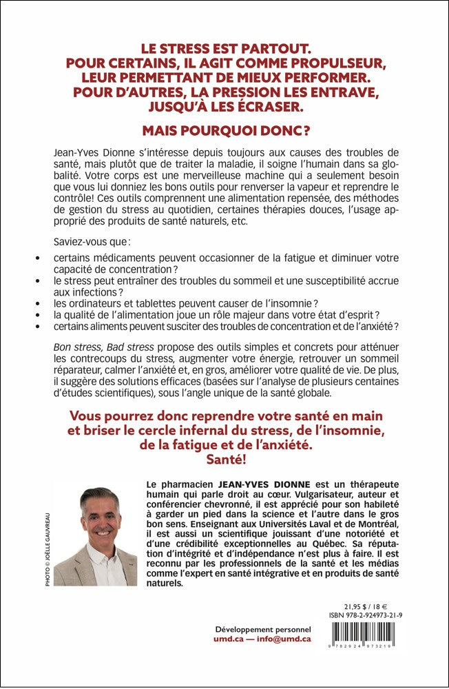 Bon stress, Bad stress propose des outils simples et concrets pour atténuer les contrecoups du stress, augmenter votre énergie, retrouver un sommeil réparateur, calmer l'anxiété et, en gros, améliorer votre qualité de vie. De plus, il suggère des solutions efficaces (basées sur l'analyse de plusieurs centaines d'études scientifiques), sous l'angle unique de la santé globale.