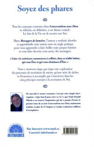 Tous les concepts contenus dans Conversations avec Dieu se référent, en définitive, à un thème central : Le but de la Vie est de recréer son Soi. Dans Messagers de lumière, l'auteur a souhaité aborder et approfondir cette notion sous un angle pratique pour vous apprendre à faire briller votre propre lumière et vous faire devenir, vous aussi, des messagers. " Votre vie extérieure commencera à refléter, dans sa réalité intime, qui vous Êtes et qui vous choisissez d'Être. " Vous y trouverez étape par étape une exploration du processus de recréation de même qu'une série de tâches et d'exercices à accomplir qui s'inscrivent dans les cinq principes menant à la recréation de Soi.