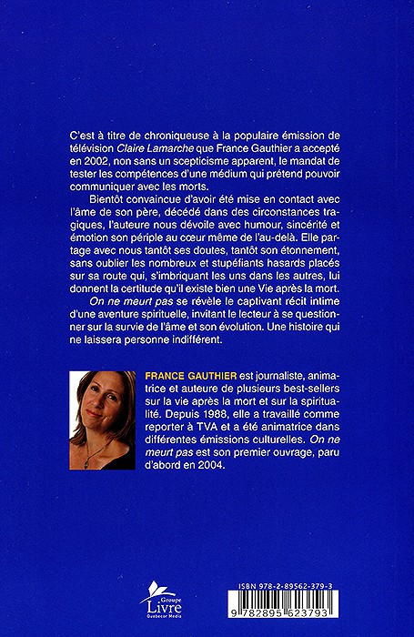 France Gauthier est journaliste, animatrice et auteure de plusieurs best-sellers sur la vie après la mort et sur la spiritualité. Depuis 1988, elle a travaillé comme reporter à TVA et a été animatrice dans différentes émissions culturelles. "On ne meurt pas" est son premier ouvrage, paru d'abord en 2004.